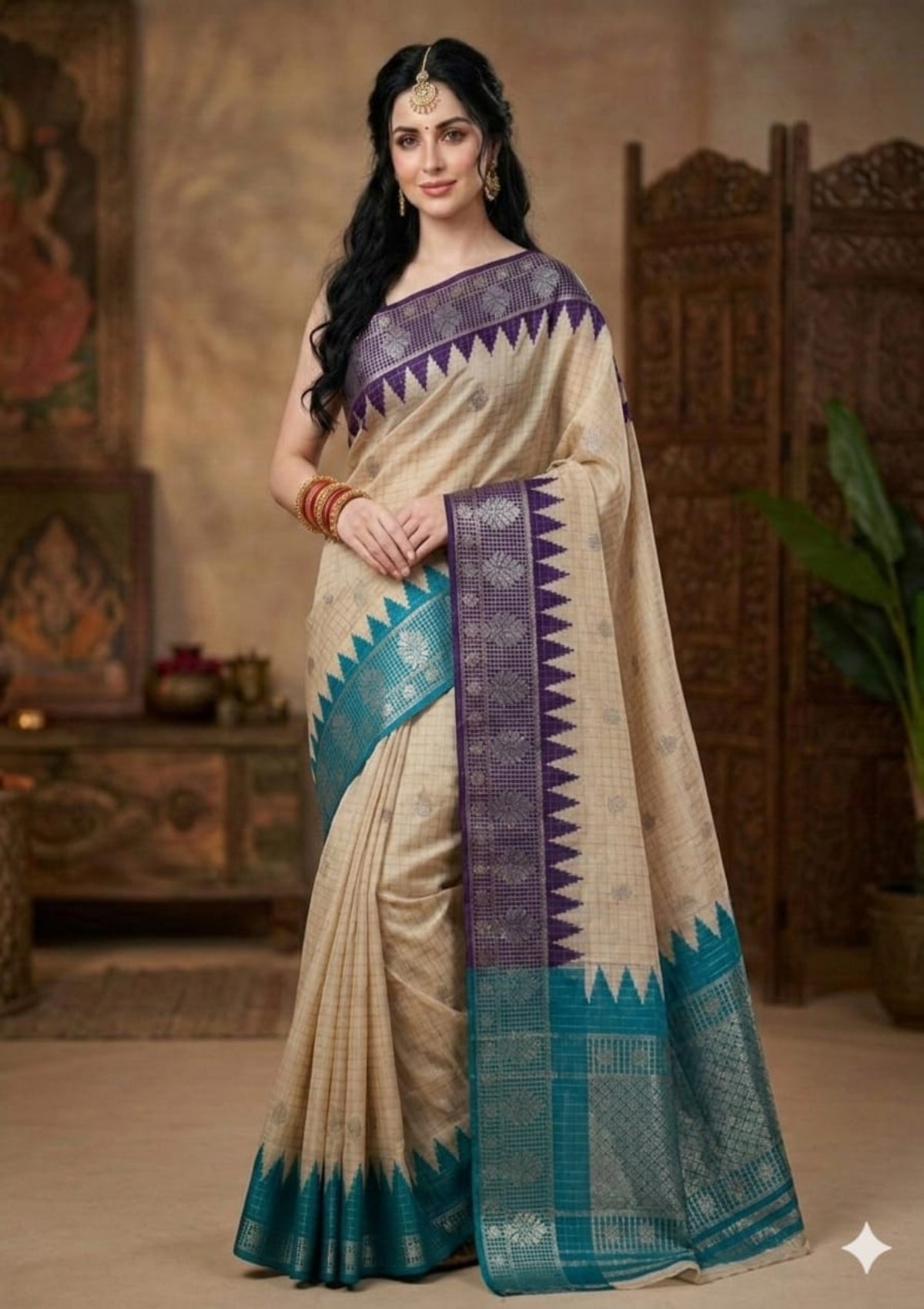 Classic Checkered Silk Saree with Contrast Temple Borders and Zari Woven Accents - D00038